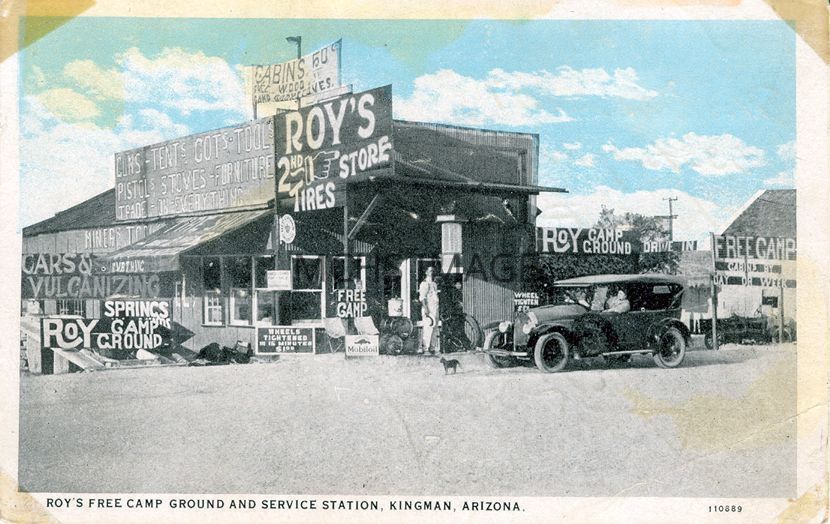 Post card from Roy's. Text on back states "Roy buys and sells new and used tired and cars. 2nd hand goods of all kings. Trades on everything."Collection