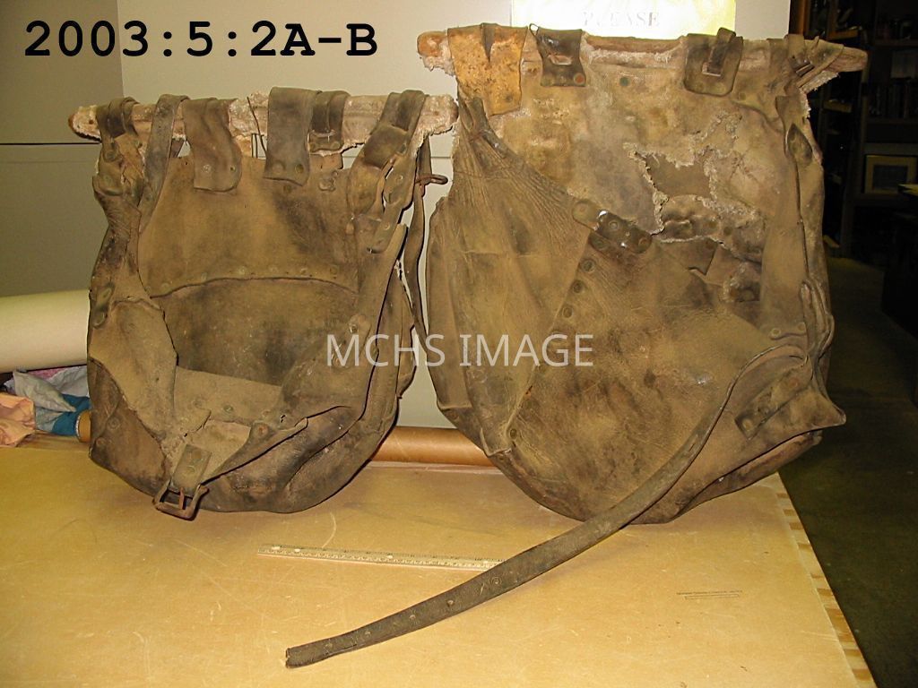 2 Leather bags (not joined) with wooden rod from which they hang. The leather is thick and stiff. They are assembled with copper rivets and show extensive use. These bags, or panyards, were used, one on either side, of a horse to haul salt blocks to the range cattle.
