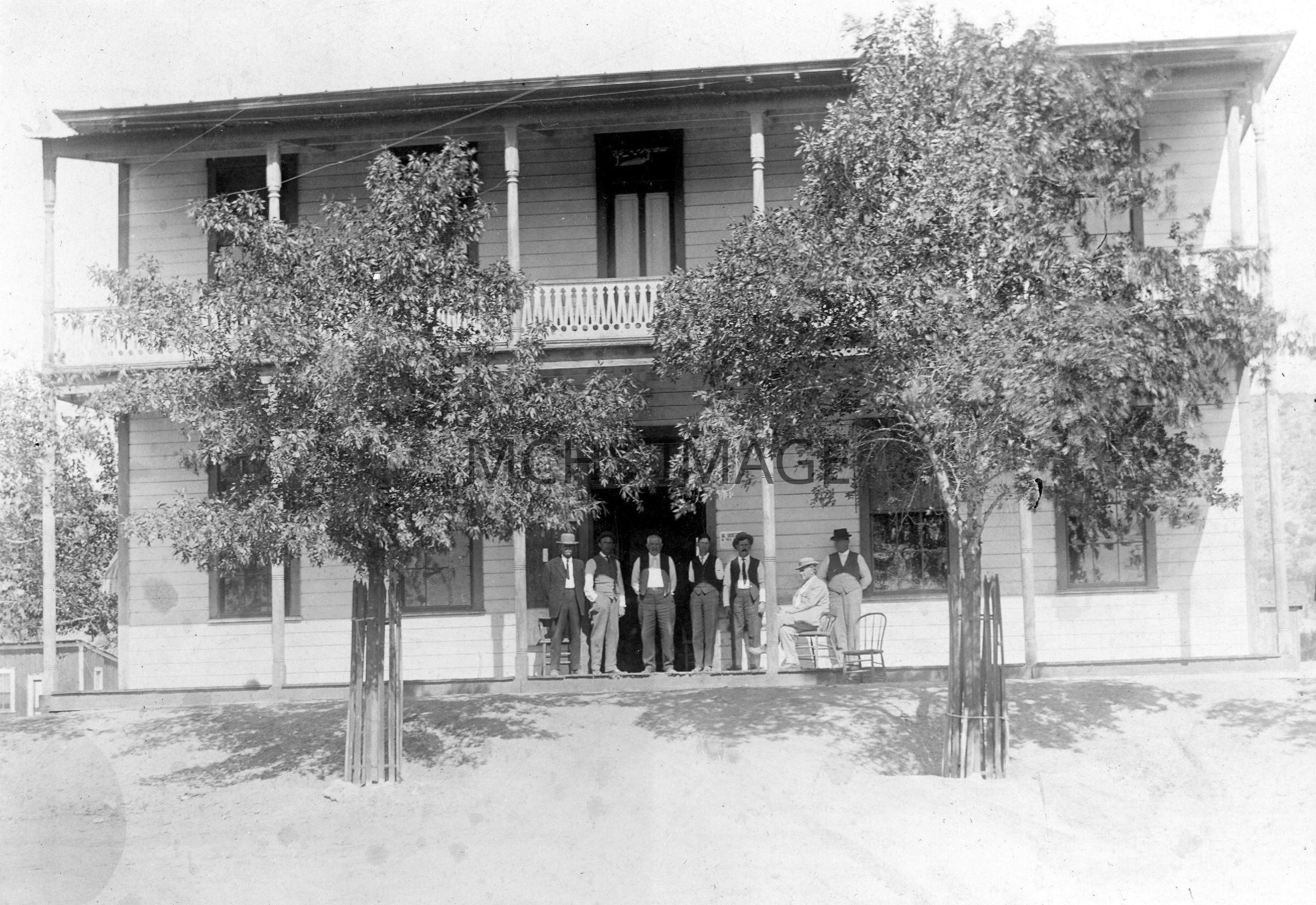 Seven men in front of old Courthouse. Plaque on courthouse says: Mohave County Court House taken October 17th, 1913. Left to right - J. P. Gideon, Sheriff; J. Bartholomew, Clerk of Boards; J. W. Morgan, Recorder; T. J. Whitney, Deputy Recorder; J. C. Lane, Undersheriff; L. M. Teale, (sitting) Clerk, Superint. Court; Thos. Devine, TreasurerCollection