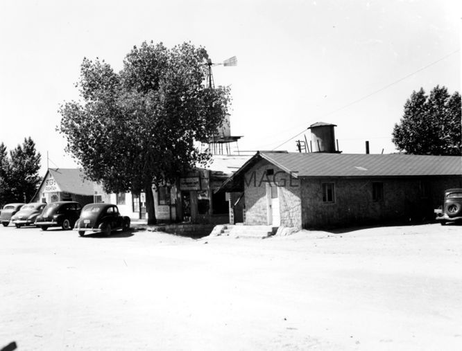 Shep's motel, fountain and store in Chloride Arizona 1940's with period cars parked on street and large tree blocking store. Owner was C.J.Shapiro.Located on 2nd St. (west side) 1 block south of Tennessee Ave.Other Names and Numbers