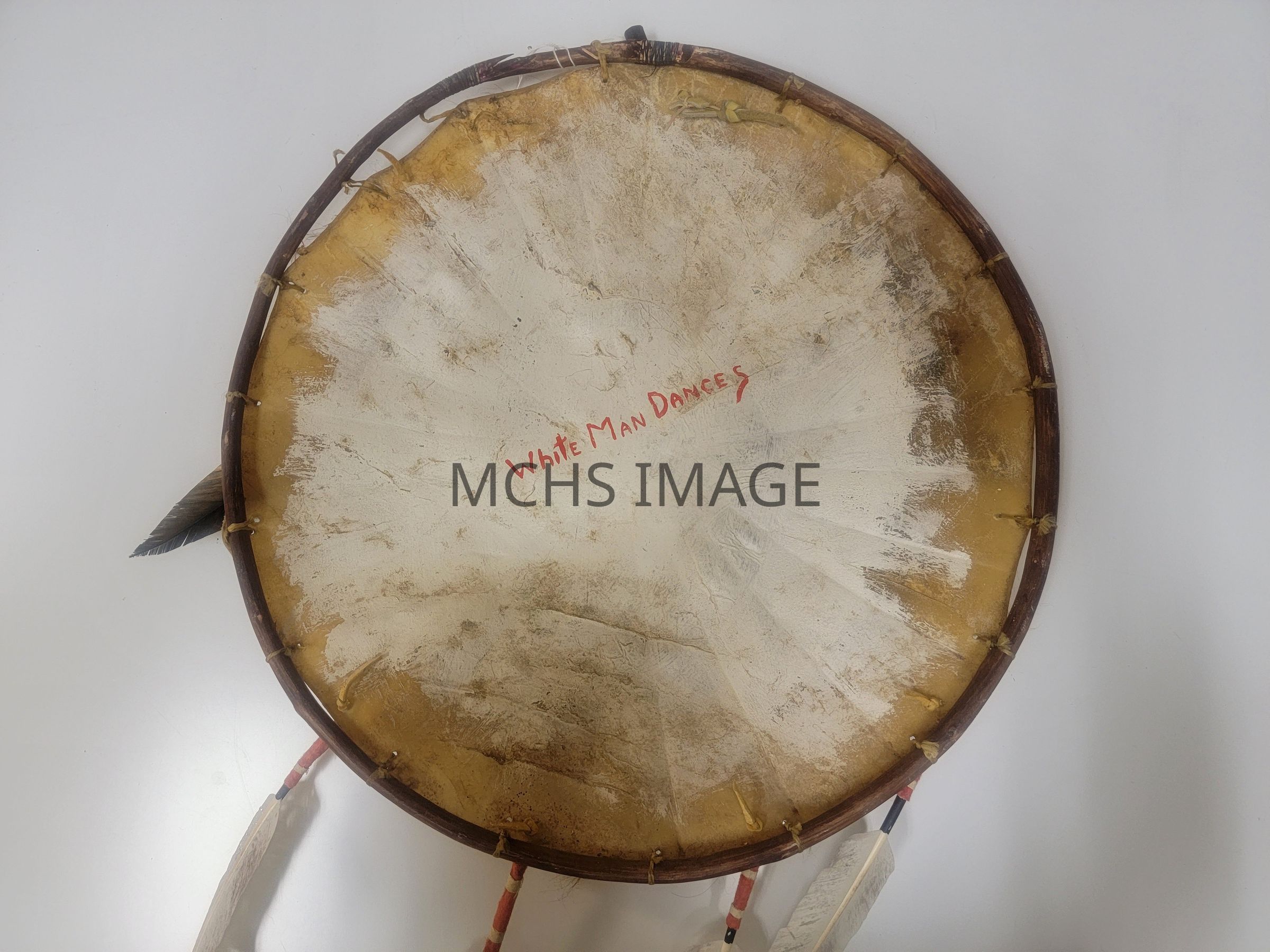 Shield, circular with 16 - 1/2" diameter. Entitled "White Man Dances" On front 1st US Cavalry is seen being defeated by native warriors. Scene depicted probably 1868-1871 when, according to the history of the 1st Cavalry, they were regularly in skirmishes with the Apache nation. In the regimental history they are referred to both as Apache and Mohave Apache. No artist signature.Collection