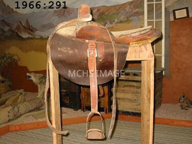 Sidesaddle, approximately 25 -1/2" long, from cantle to pommel area, 14" wide seat. Skirt is approx. 15" long. Stamped on the skirt is a diamond with a 'j ' in the center and below that is the number "415". Under the forward lip of nickel plated stirrup's base is stamped, "FRONT". Condition is fair, the leather is very dry and stiff and is badly worn at the far side of the seat and at the crowns of the leg pommels, the cinch strap has broken and the nickel plating on the stirrup is peeling in places.