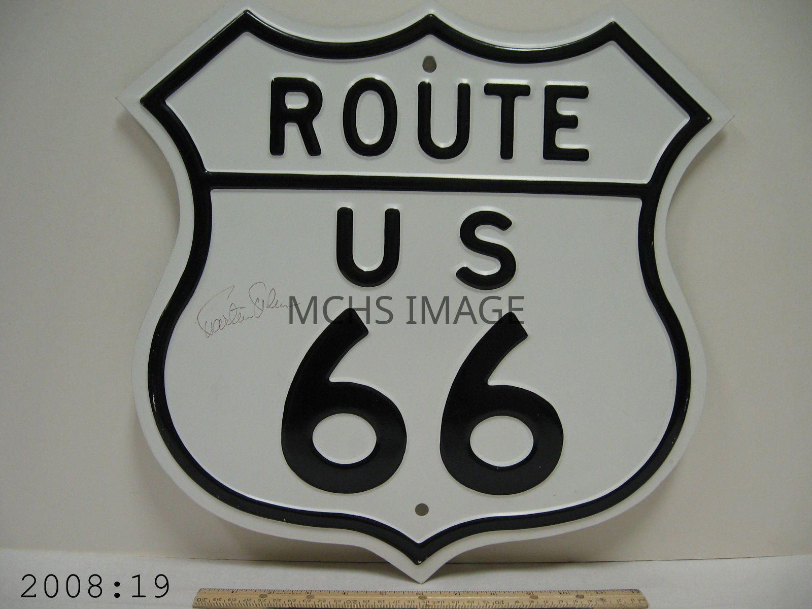 Road sign, 16" x 16" in excellent condition. Shield shaped sign, black on white, "Route 66". Donor: In 1987 the city of San Bernardino Ca. celebrated the 50th Anniversary of the famous Route 66. Martin Milner, from the TV series "Route 66" which aired until 1964 signed this Route 66 sign at that celebration.