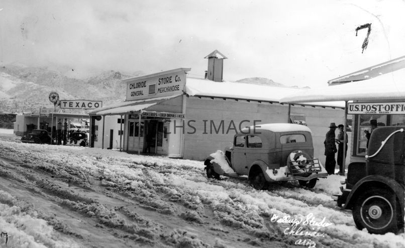 Snow on Streets of Chloride, Tennessee Ave looking east & 2nd St., Chloride Store (Ware's) & Post Office, Union 76 Service Station at 2nd St intersection, Texaco Service Station 33 or 34 FordCollection