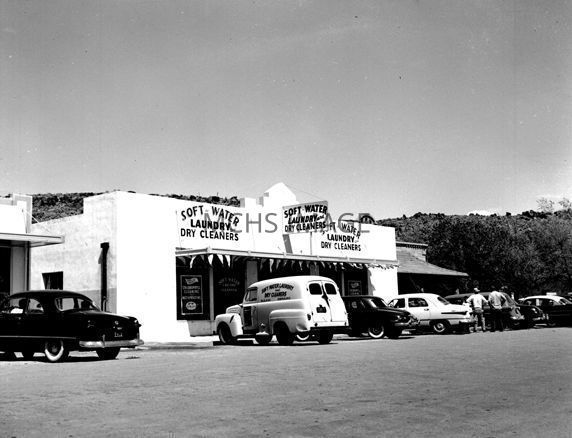 Opening of Soft Water, Laundry & Dry Cleaning; banners are hanging from the canopy, several cars are parked in front. Beale StreetCollection