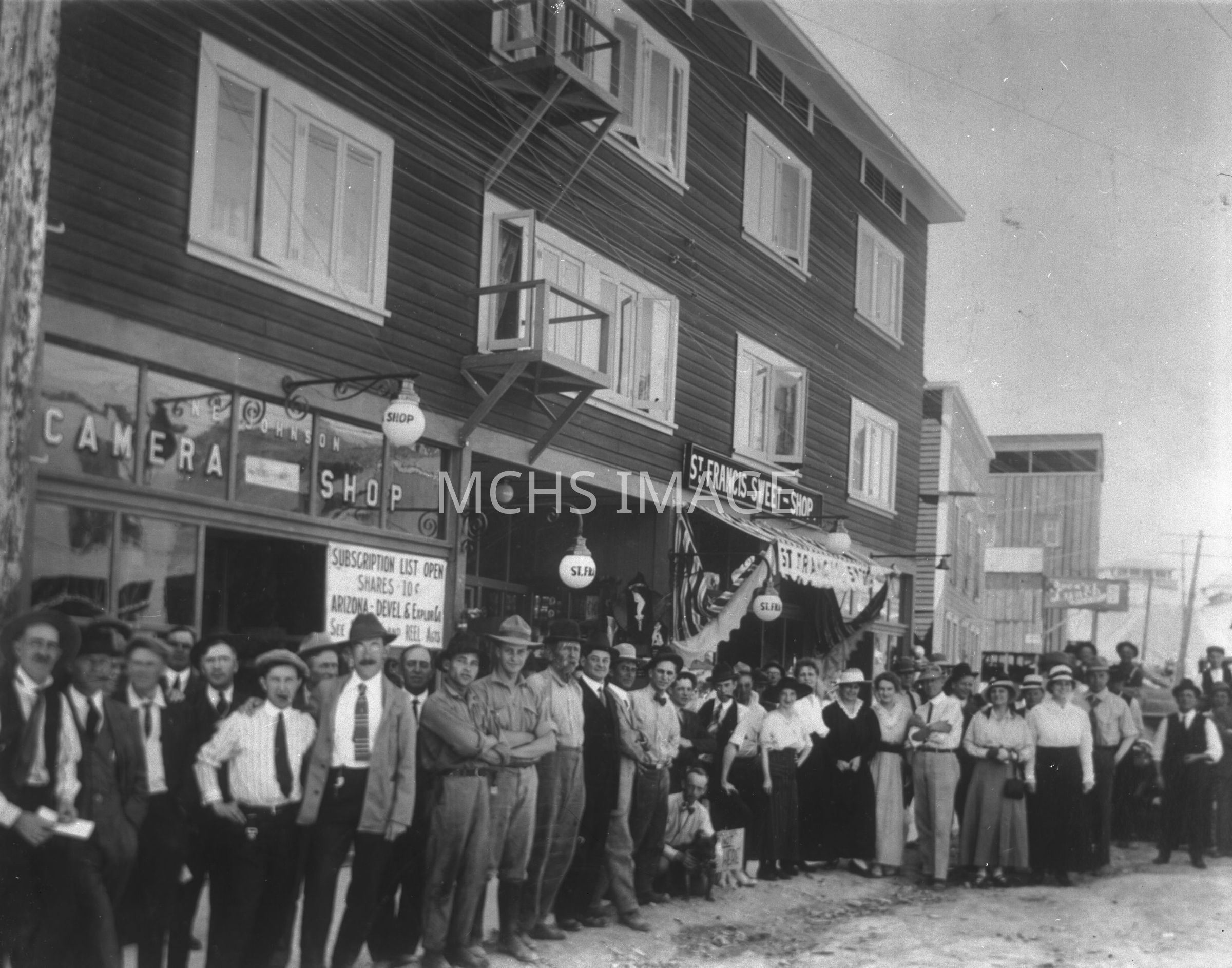 Photo of a group of people standing in front of the St. Francis Hotel, showing the sweet shop and camera shop.Collection