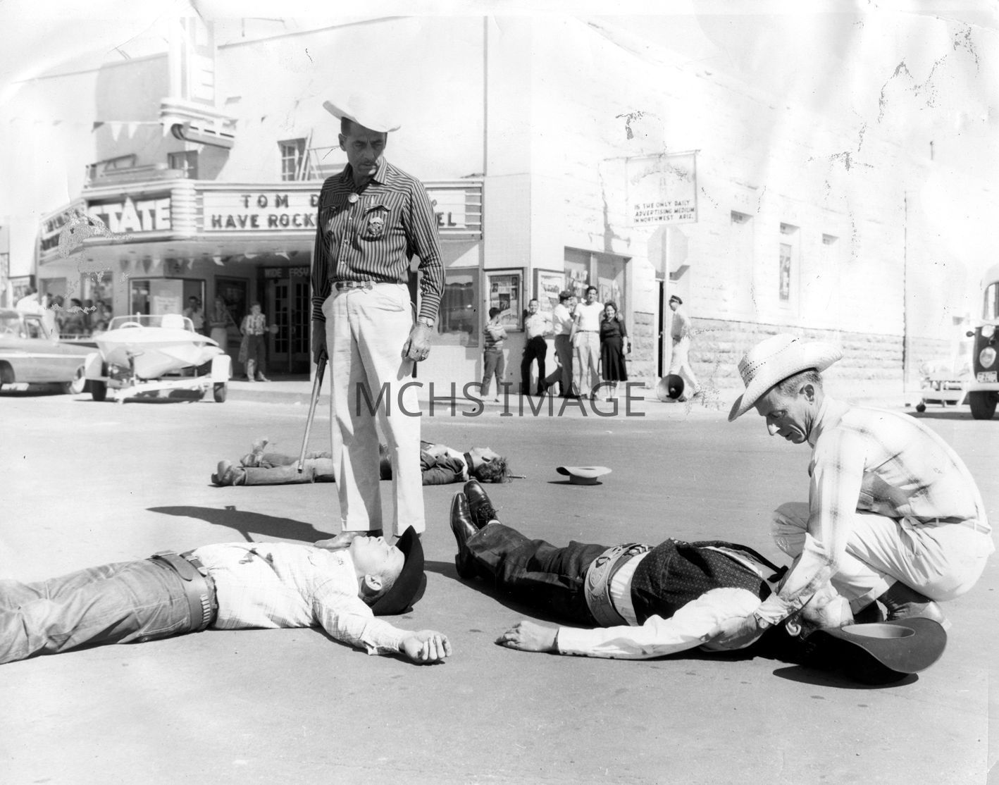 On corner of 4th and Beale Streets in Kingman with State Theater in background. Left to right; Hal Kraft, Owen Finch, Bud Lacey, Glen Webb, Neil Keim.Collection