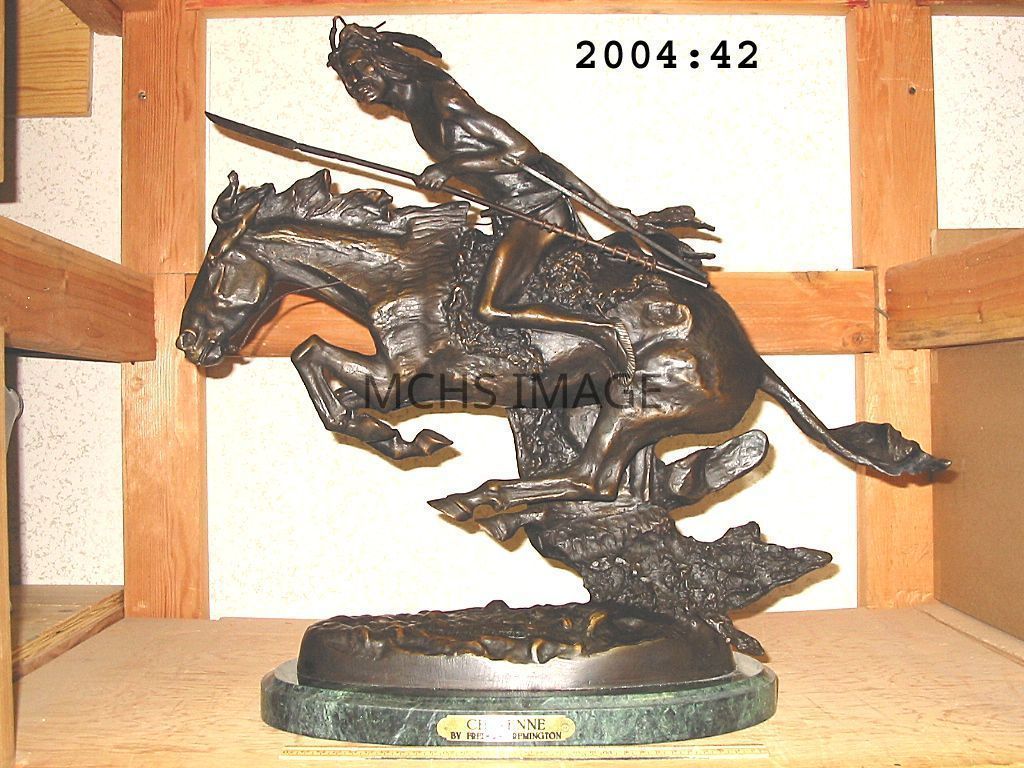 Bronze 20" statue of a Native American on horseback, by Frederic Remington, entitled "Cheyenne". Reproduction.
