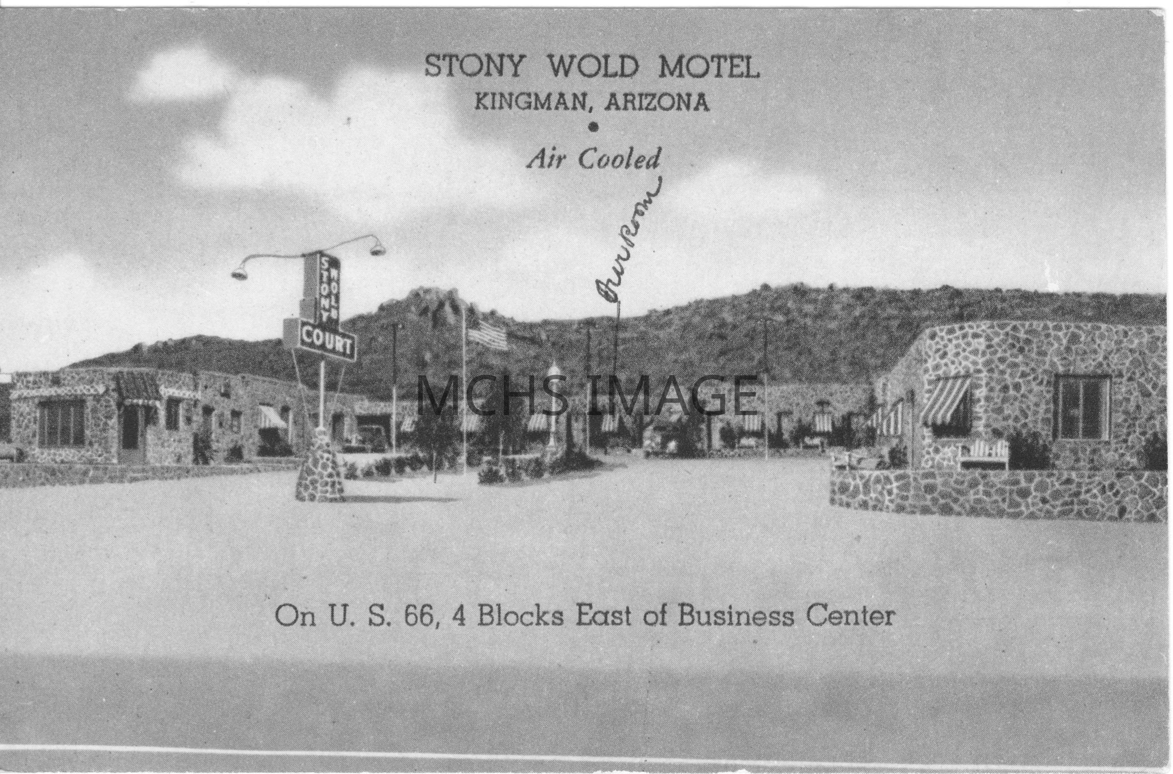Stony Wold Motel, built in 1940 by Max Kinnie & Bill Negus. Air cooled with a patio enclosed swimming pool. Constructed entirely of black Malapai stone, a volcanic stone found abundantly in colorful Arizona.Collection