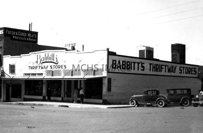 A panoramic view of both stores, several cars are parked on the dirt road. SW corner of 4th and Beale StreetsCollection