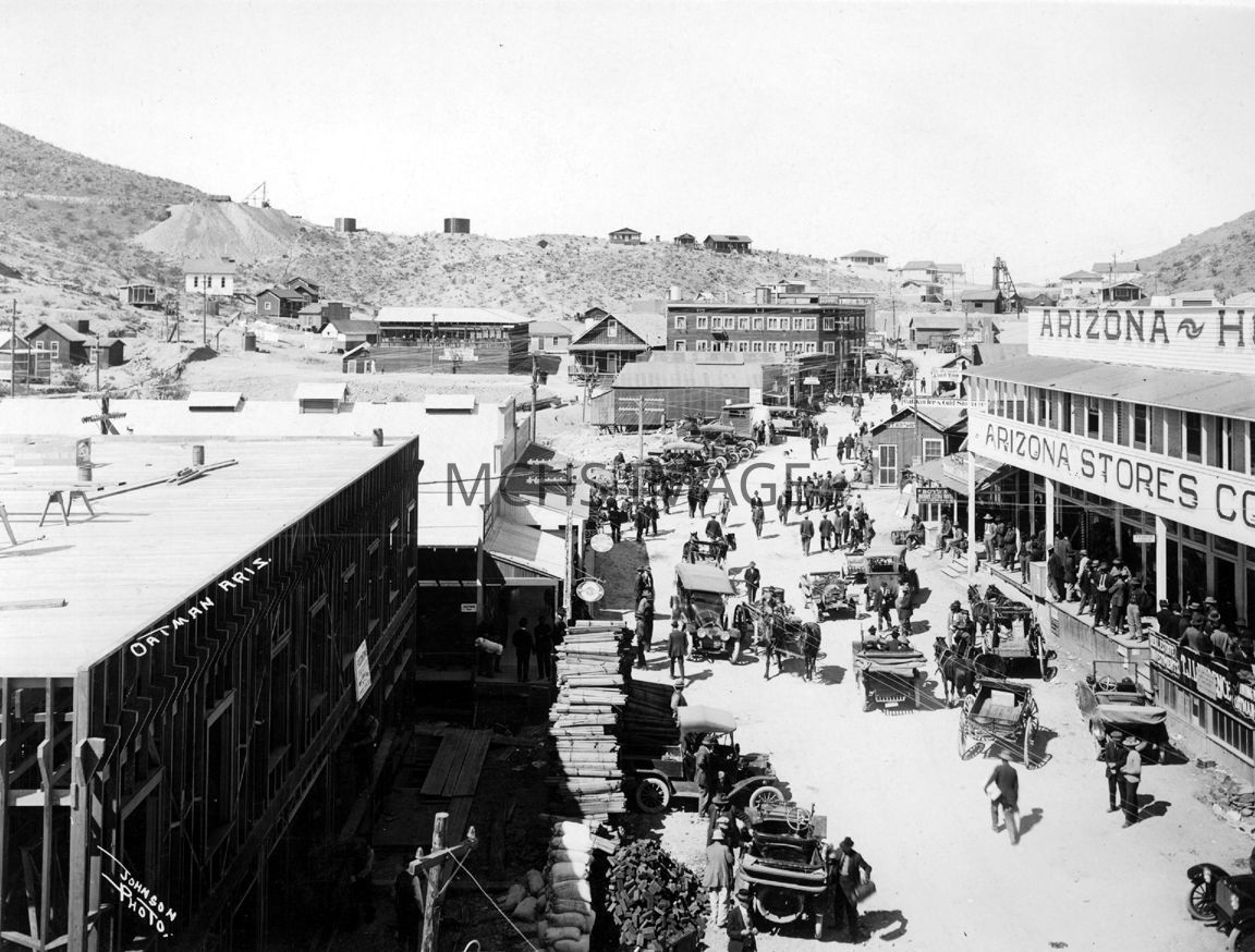Photo showing business area, with St. Francis Hotel in background, the Bank to the left, and Arizona Stores to right. Year unknown.Collection