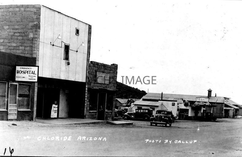 Street scene on Tennessee Ave. south side, Dr. A.A. Arnold's 1st office, theater, unidentified brick shop, Union 76 Service Station 2nd St., Seiberling Texaco Service Station & Chloride Store Co., 1936 Plymouth in right foregroundCollection