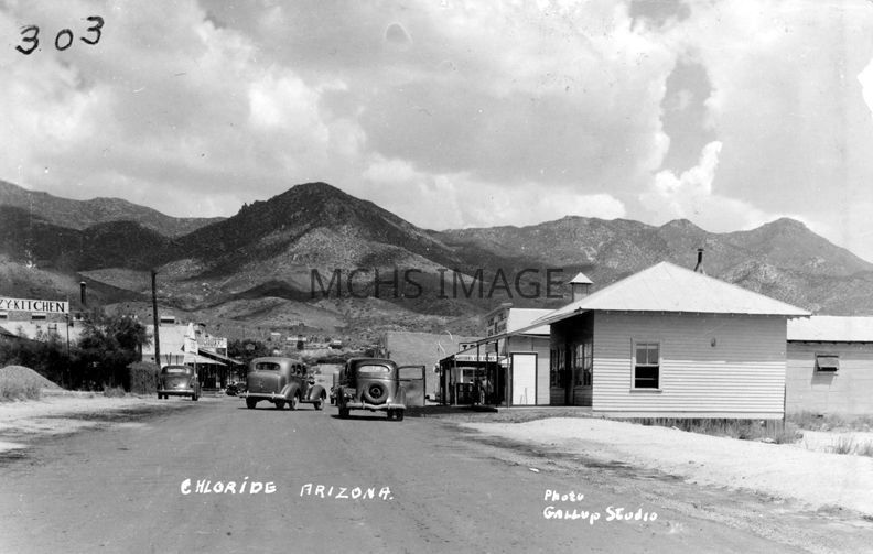 Chloride at Tennessee Ave., Left to right, Cozy Kitchen Café (Rose, Later Scott) at 2nd St. intersection, Club Café, Chloride Meat Market, (across the street to the right) Union 76 Service Station sign, Partial "Texaco" sign, Chloride Store co (John Ware), U.S. Post OfficeCollection