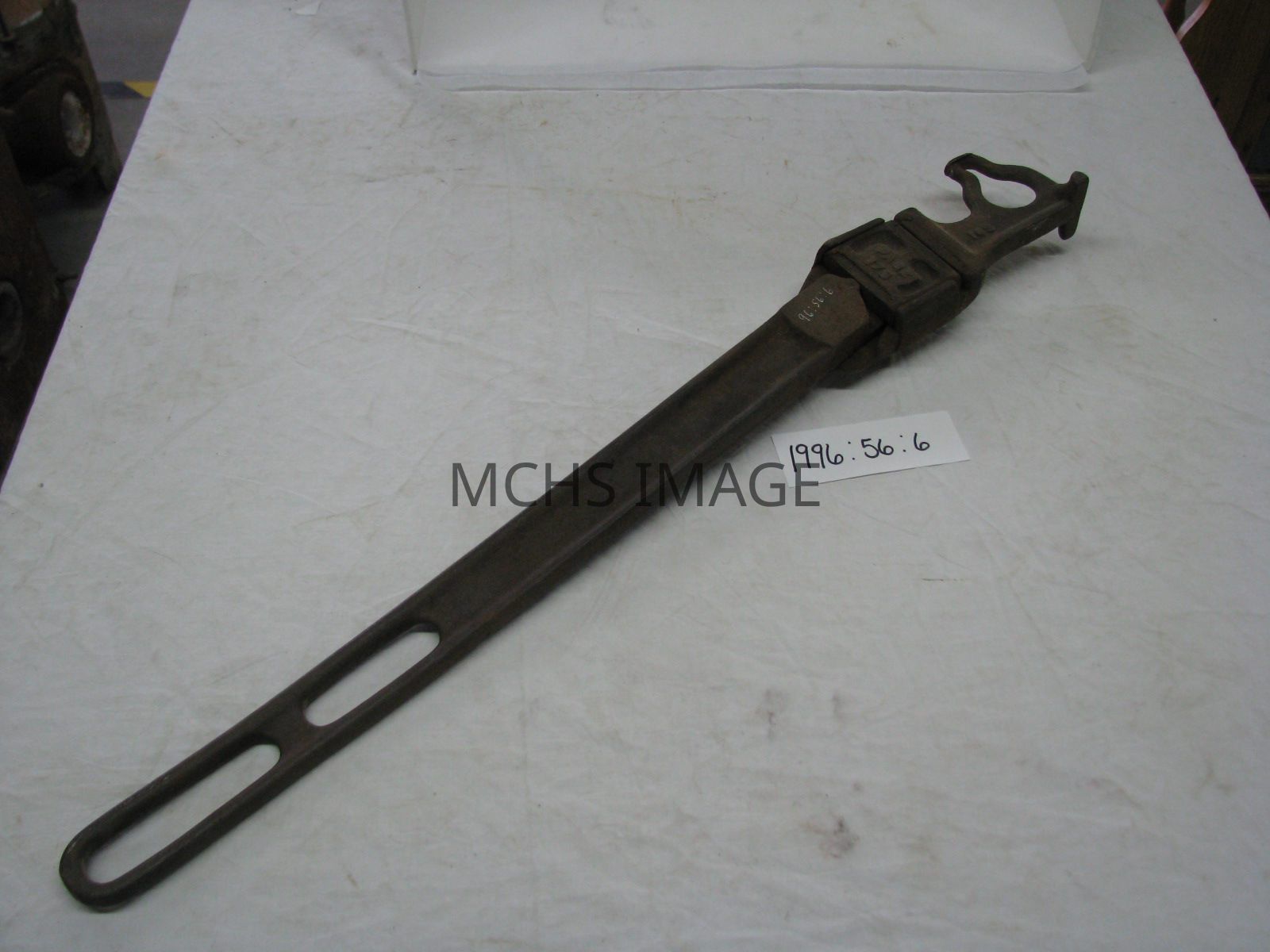 Wire stretcher is 27 - 1/2" long, made by Page, all metal, long handle with double hand holes, head has "16S" near the key hole opening, the body has "17S" imprinted on it, the handle has "18S" and a triangle containing the letter T.