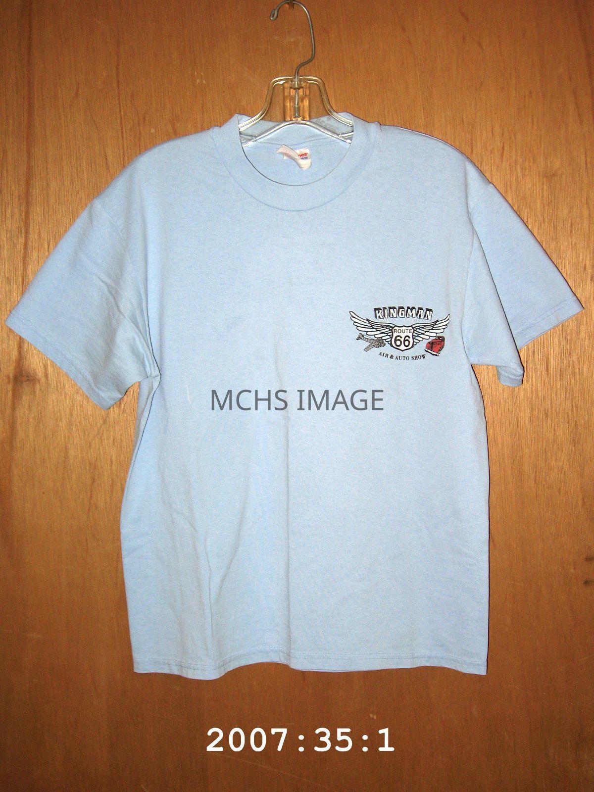 Tee shirt, size Adult M, made by Haynes, in excellent condition. Light blue cotton/polyester shirt with design over left breast: