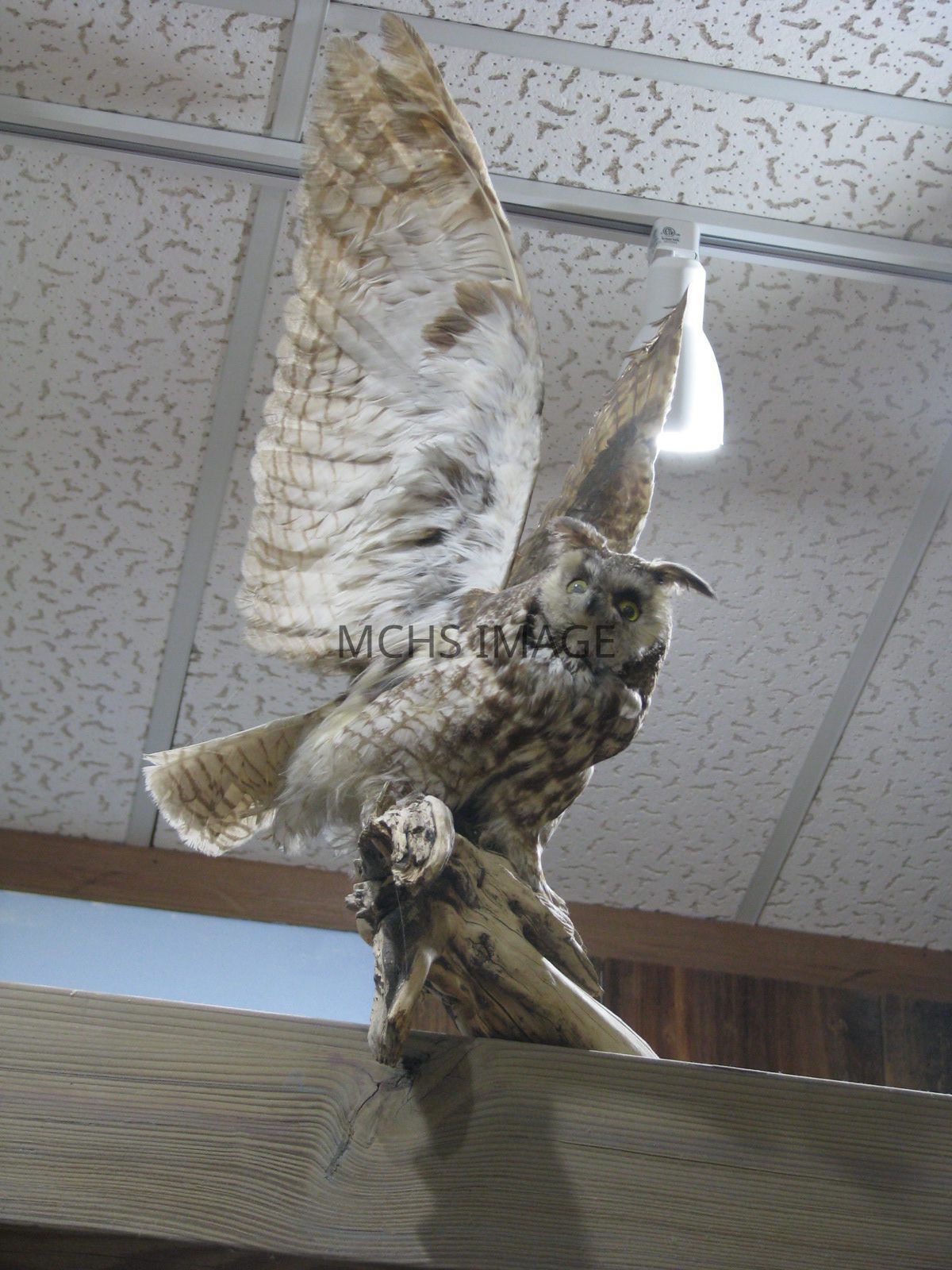 Long eared owl taxidermy is white with black specks, mounted on plaque, inscription: "Donor, David Parker, Taxidermist, Henry Aguilar". **Found on Hualapai Road, it is a protected species.**