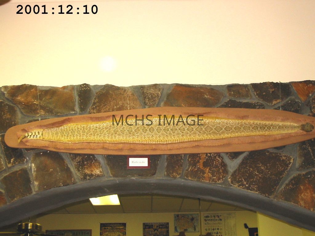 Rattlesnake skin mounted on a board. No information available at this time as to length of the snake at the time it was killed & mounted.