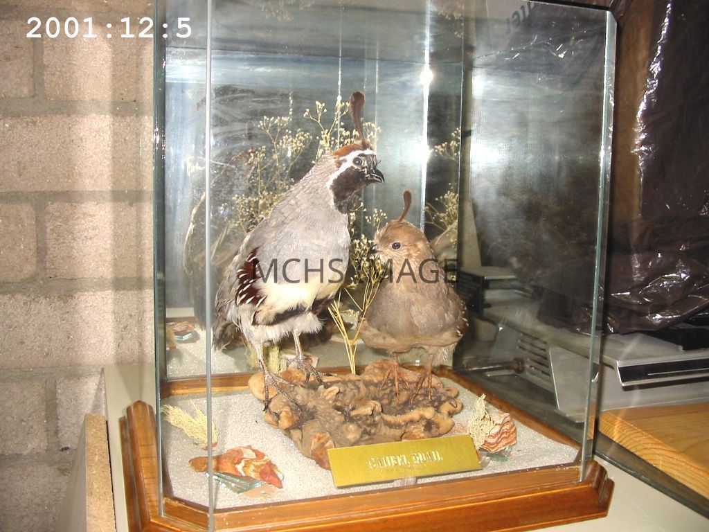 Gambel's quail, mounted on a small base with metal name plate. (When donation was accepted, Quail were mounted and placed in a glass display case of it's own. The display has been removed from the glass case.)