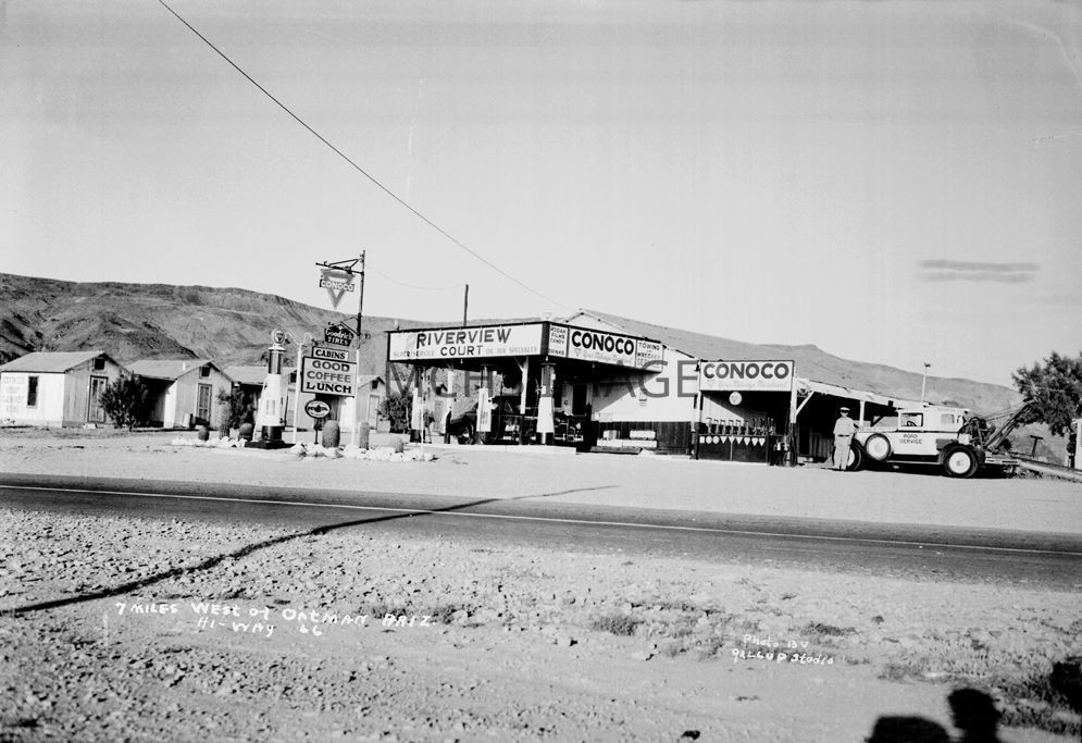 Conoco Station 7 mi west of Oatman. There is a man standing by a truck on the right which reads "Road Service". There is a car parked under the station canopy.Collection
