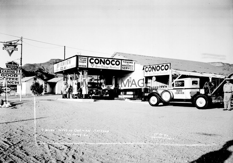 Taylor's Conoco Station 7 mi west of Oatman (old Highway 66). A tow truck is on the right and a car is parked under the canopy. Probably located on the flats and the straight part of the Highway past the White Chief Mine in lower Oatman.Collection