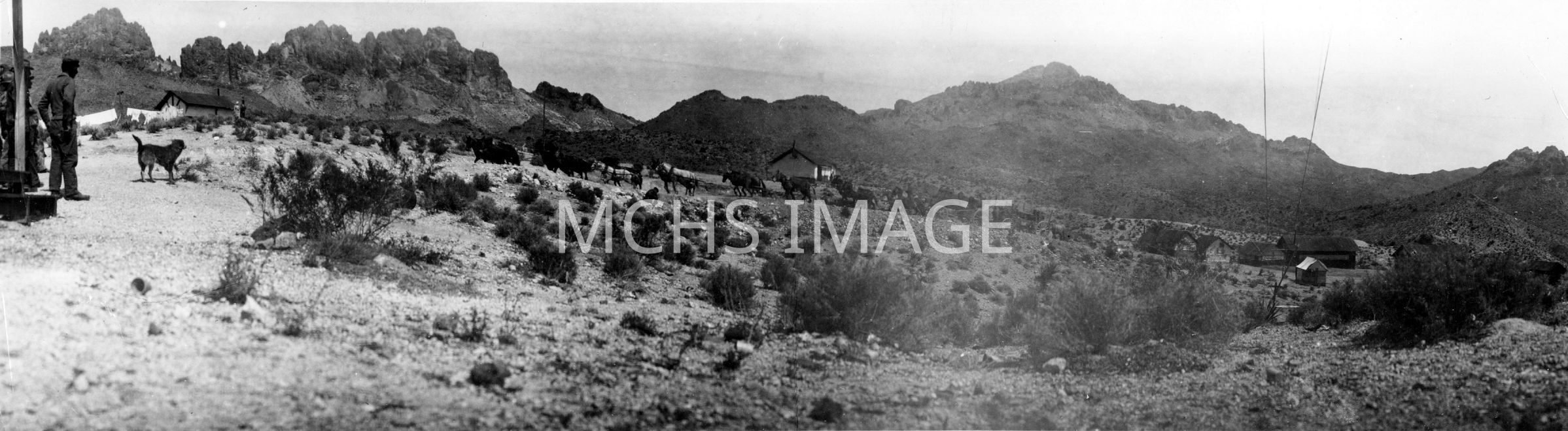 Team hauling engine past camp A-2 cylinders and 1 flywheel-2 tons; B-crankshaft 7 1/2 tons; C-Chicago Pnuematic Tool Co., Belet, Wis., manufactured the engine; D-Hauled by railroad to Kingman, then from Kingman by rail to Chloride Line's Union Station.Collection