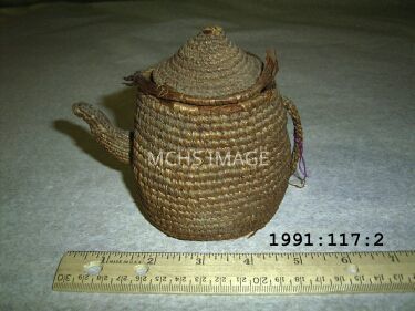 Basket is 4" tall, shaped like a small conventional tea pot, with separate lid, the base coil is Cedar bark wrapped with fiber from under the exterior bark of the tree, it is dark brown in color. Hualapai native american made?