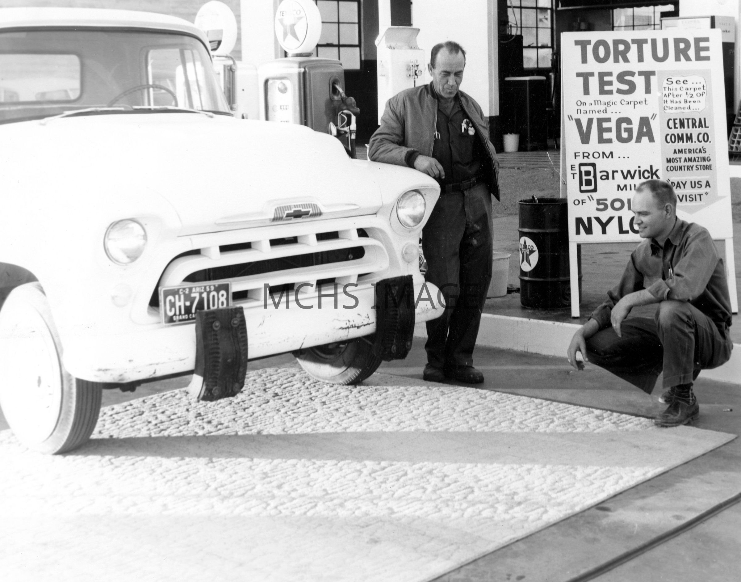 Texaco Service Station at 5th and Andy Devine, taken in c. 1959. At left Standing is Wesley Britt, and Johnny Campbell at right.Other Names and Numbers