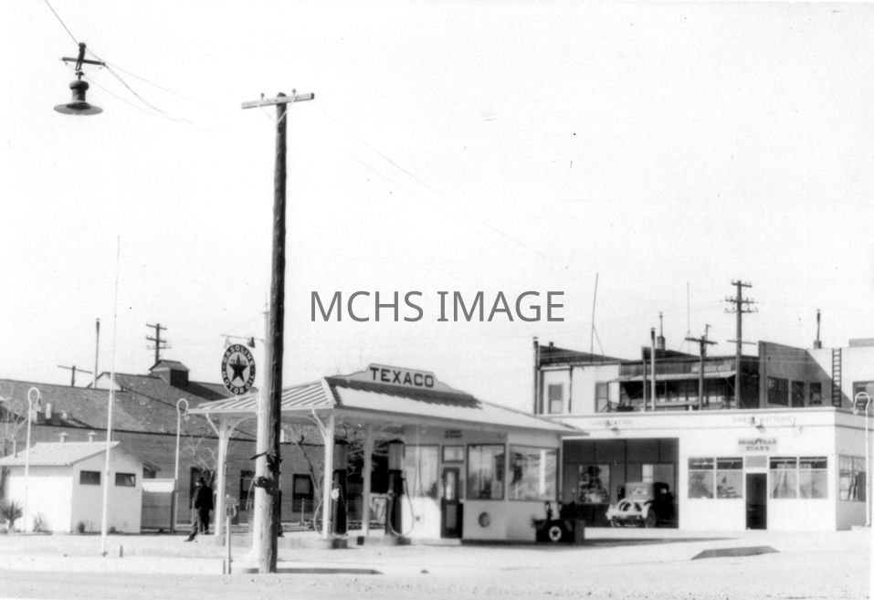 Texaco Station with a garage in back. A car is parked in the garage maybe for repairs. A warmly dressed man is strolling across the lot. Corner of Front St. (Andy Devine) (Rt. 66) and 5th St.Collection