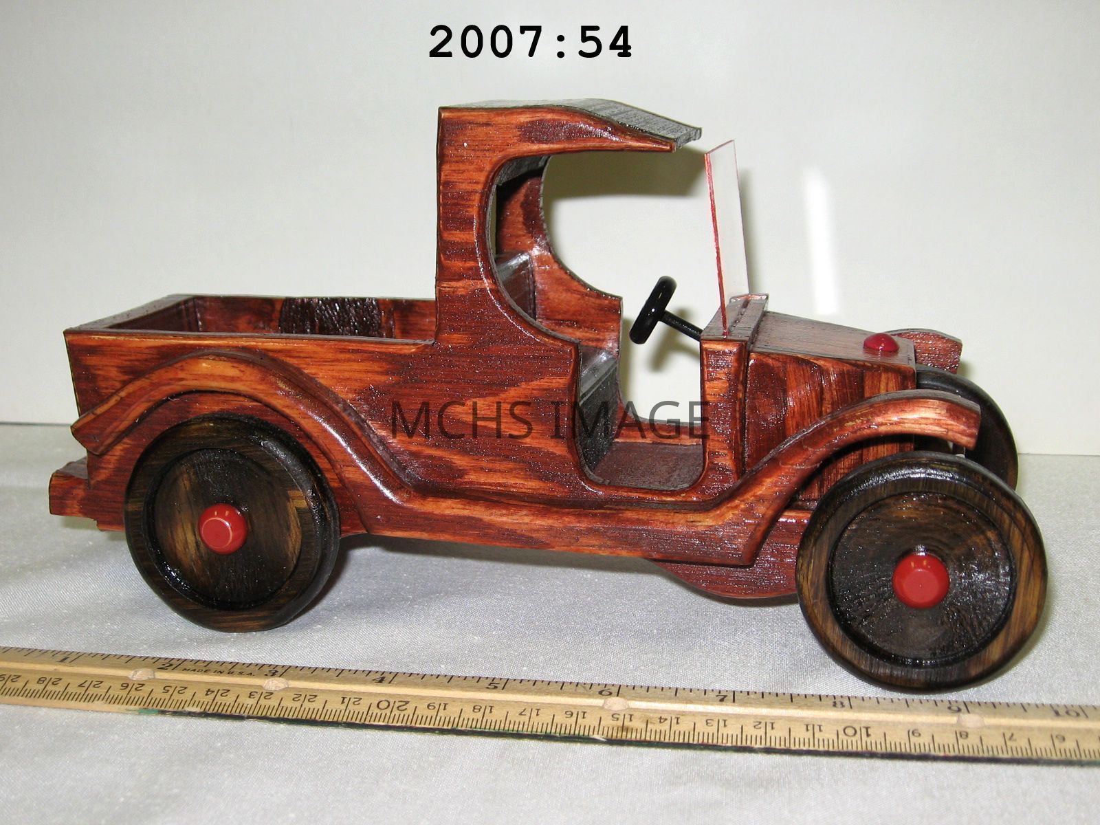 Model car (replica automobile), 10" Long x 3.75" Wide x 5" High. Made by Bill Hirsch, in excellent condition. Wooden replica of a 1923 Ford C Cab pickup truck.