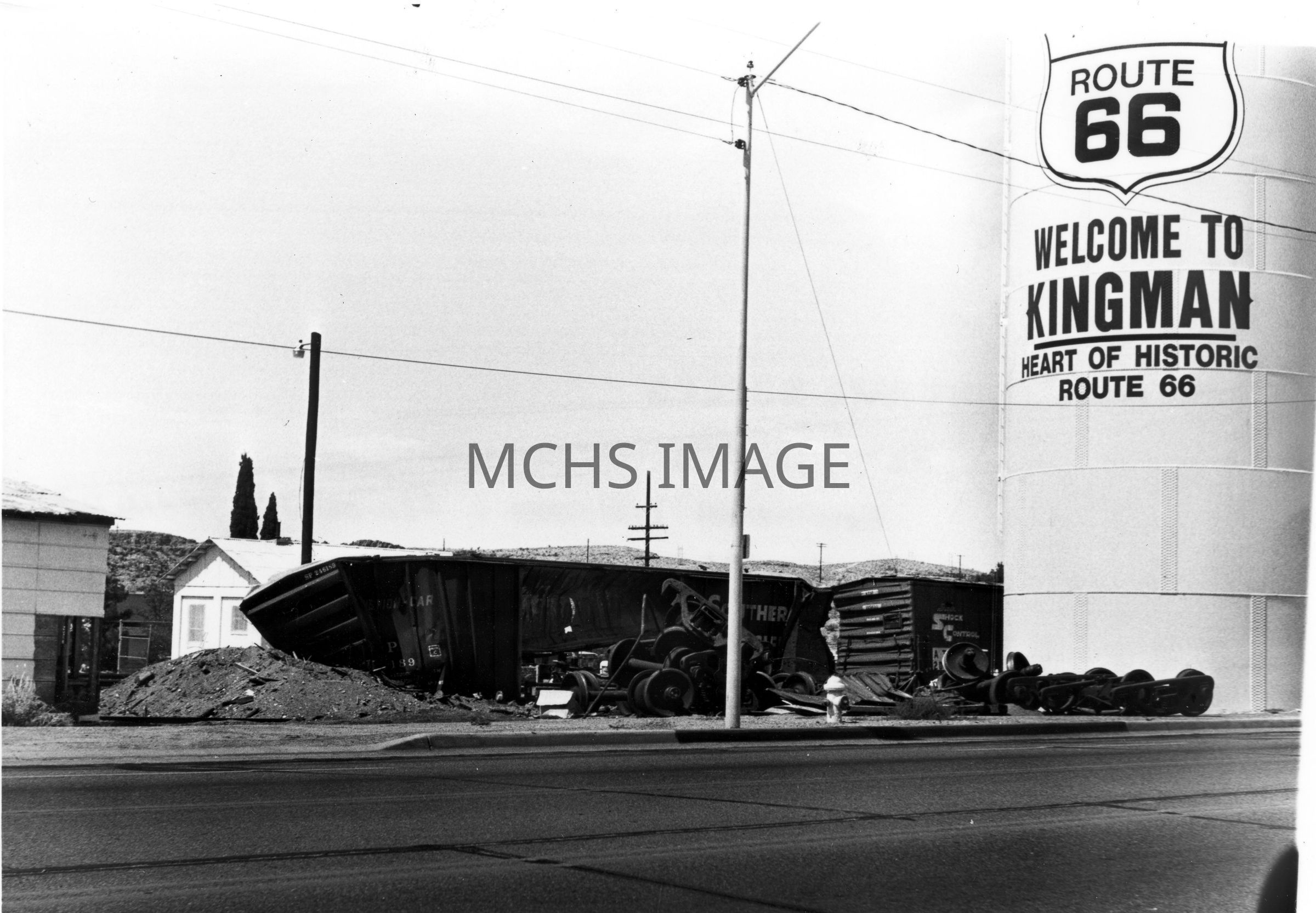 A train derailment by the "water tanks". The water tank on the right reads "Route 66 - Welcome to Kingman - Heart of Historic Route 66". Santa Fe Railroad. 5th and Andy Devine Sts.Collection