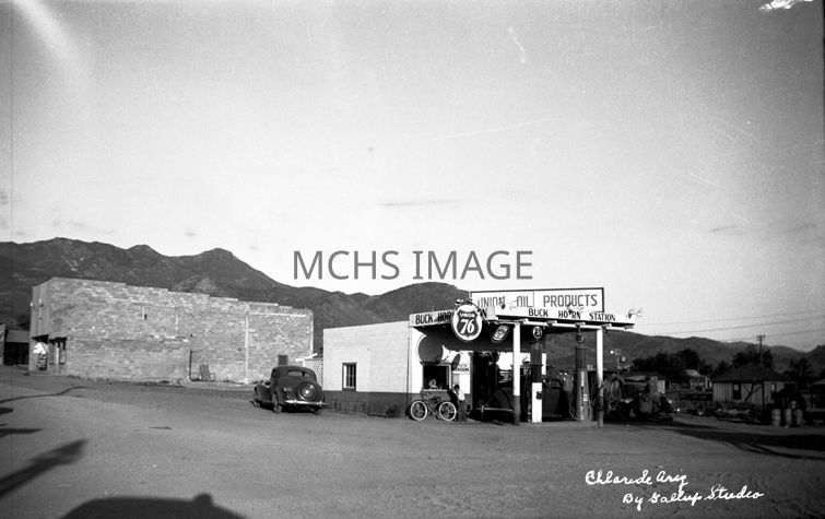 South East Corner of Tennessee Ave and 2nd Street, Chloride. L-R; Chamber of Commerce Building (with sign hanging out in front) [see image 5518] Large Movie House (brick), Vacant shop this side of Theatre., Buck Horn's Union 76 Service StationOther Names and Numbers