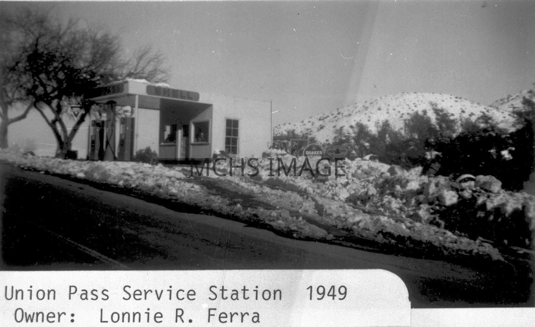 A Shell station, snow by the roadside and on the nearby mountains, owner Lonnie R. Ferra.Collection