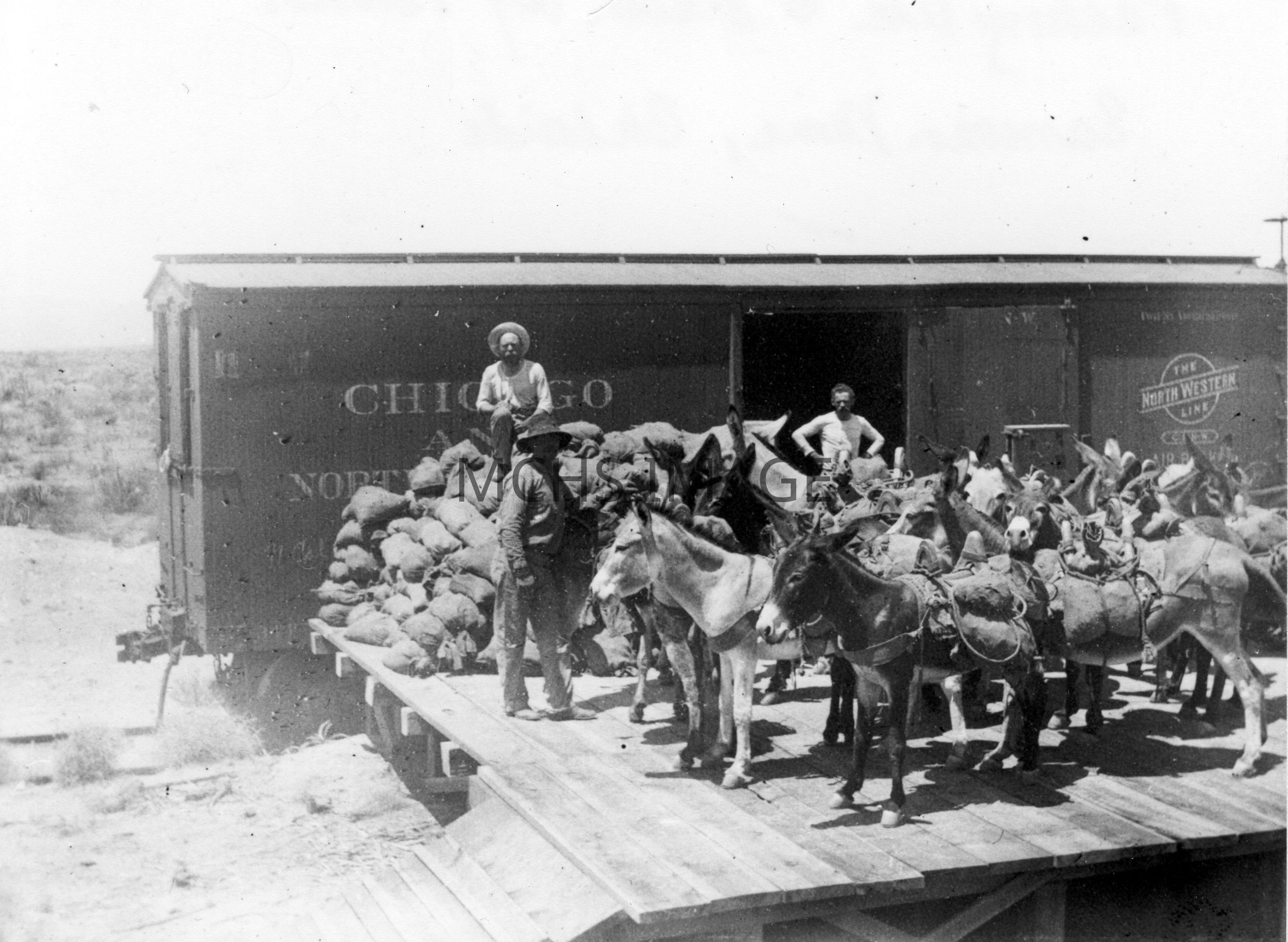 Photo showing burros' being unloaded with ore from the Samoan Mine at Chloride Station. View is from the sw end of Silver HillOther Names and Numbers