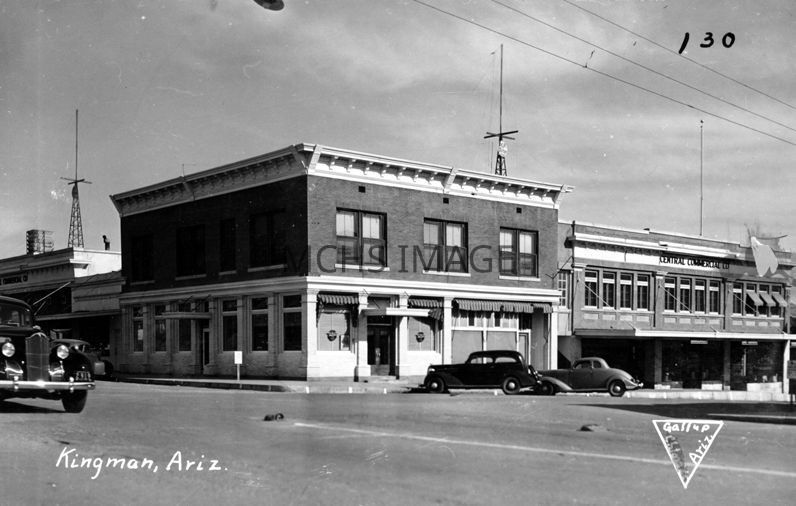 A two storied building with awnings over the lower windows on the western side. There are 2 cars parked on the west side and a car in the intersection. SE corner of 4th and BealeCollection