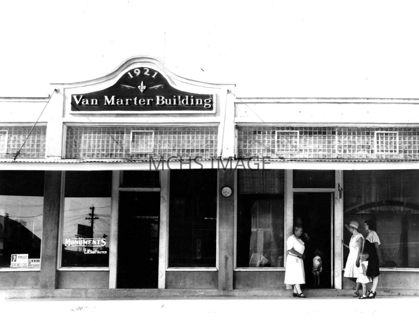 The Van Marter Building located on the north side of Beale St. between 4th and 5th Sts. The building is still (2003) standing next to Stockmen's Bank. There were three different spaces available for shops in the building. There are 3 women and a child standing in front, a car is partly visible.Collection