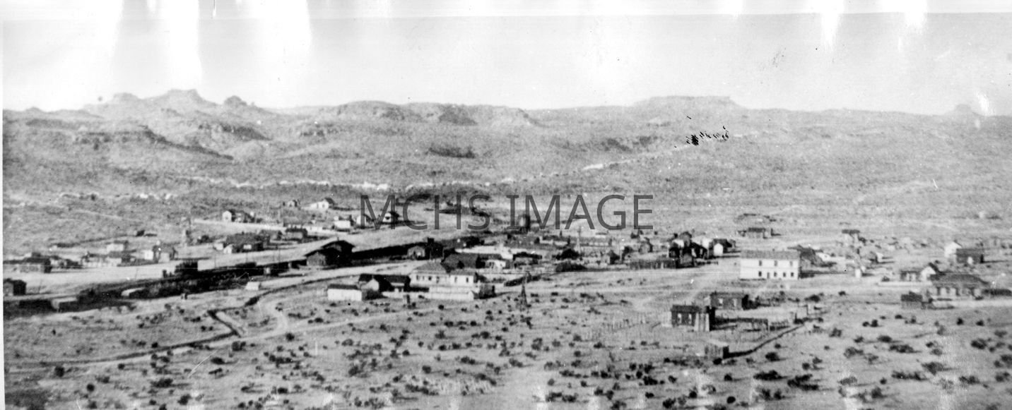 View of Kingman from northeast. Atlantic and Pacific Railroad Station is split level dark structure in left center of photo. Blakely House in photo, built 1887, St. John's Methodist Church (built 1889) not in photo. First railroad depot is large dark building in center left of photo and shows an addition built in 1888. Taggart Hall, large white building at right middle, it moved in 1891.Collection