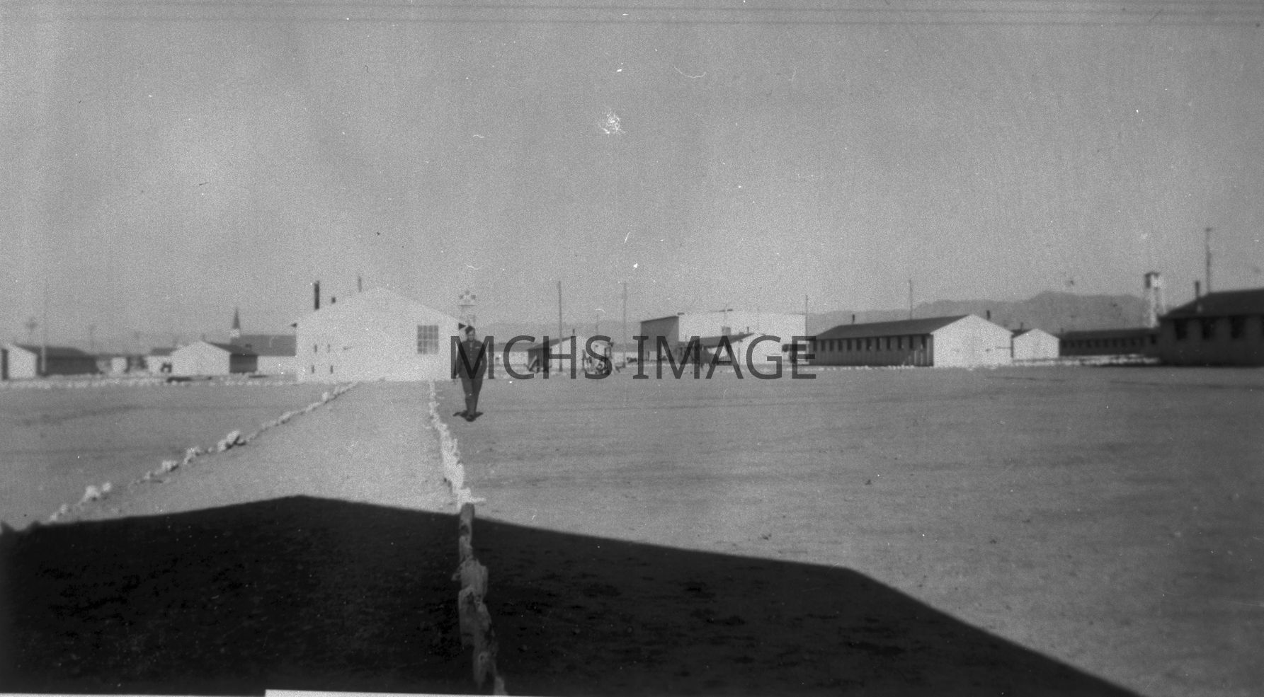 View showing man walking with post buildings in background at Kingman Army Air Field.Collection