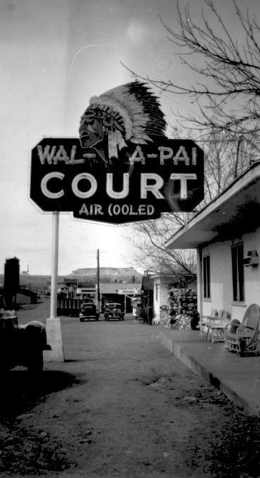 Wal-a-pai Court (Air Cooled) sign with Indian Chief in front of motel. Leafless trees in background. Front St (Andy Devine) & 6th St.Collection