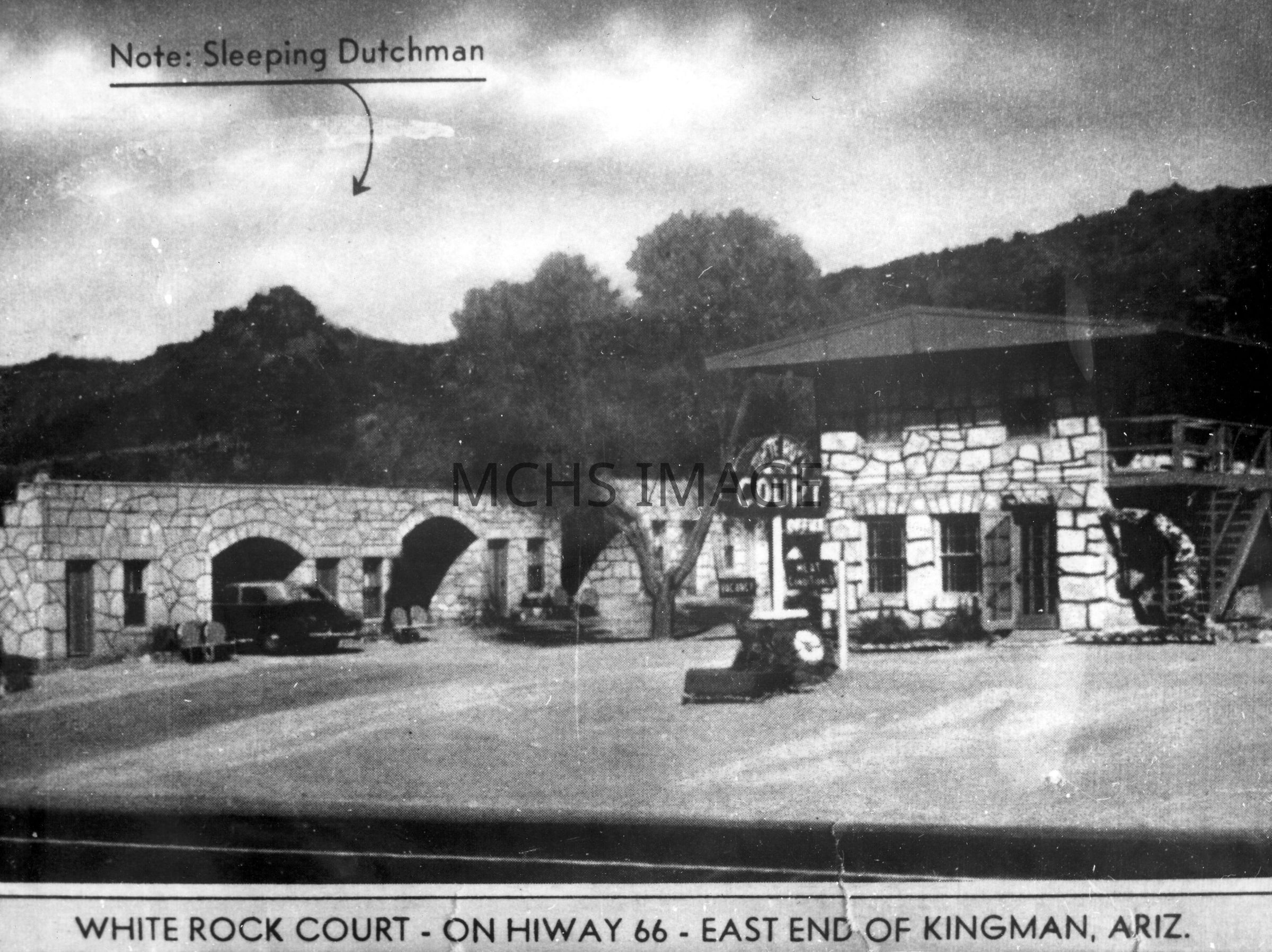Stone motel on Highway 66, Sleeping Dutchman rock formation in background.Collection