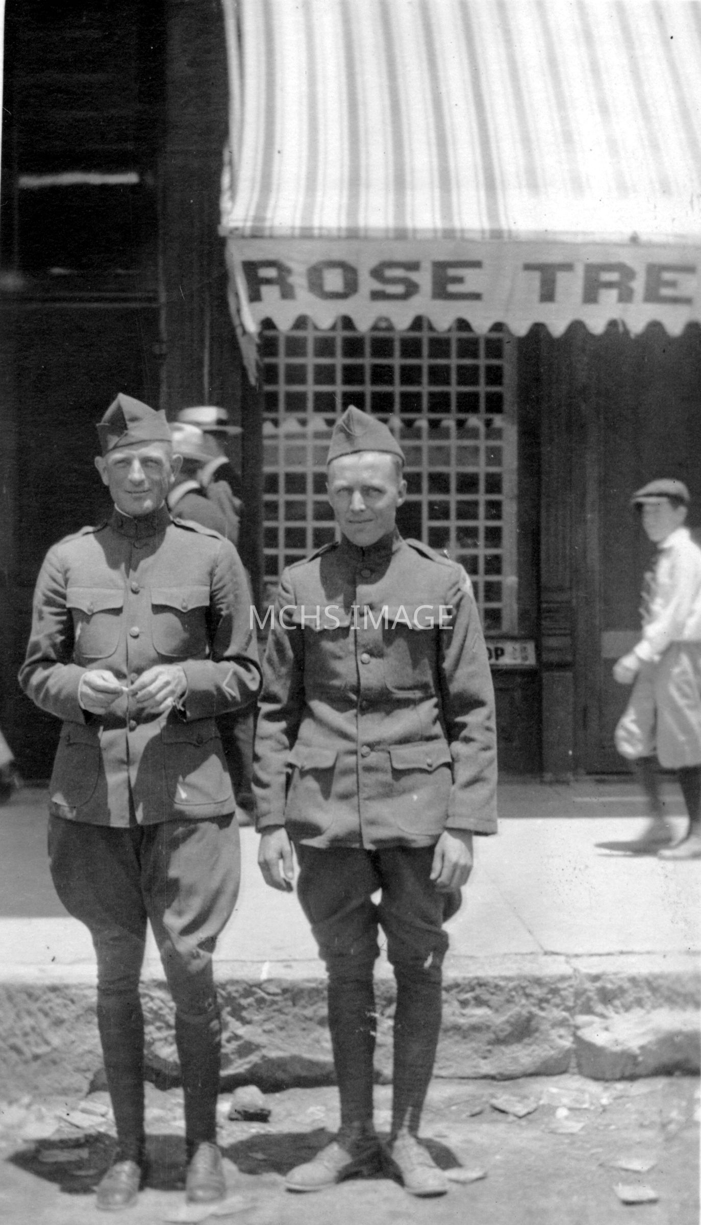 Photo taken in front of Rose Tree Ice Cream Parlor, Kingman 1919. The men are Cleve Walker, and Vernon Hubbs.Other Names and Numbers