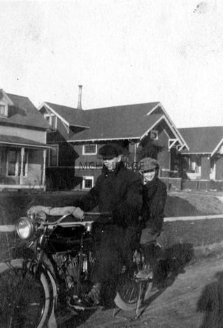 Young Andy Devine (about 10 years old) on the back of a motorcycle