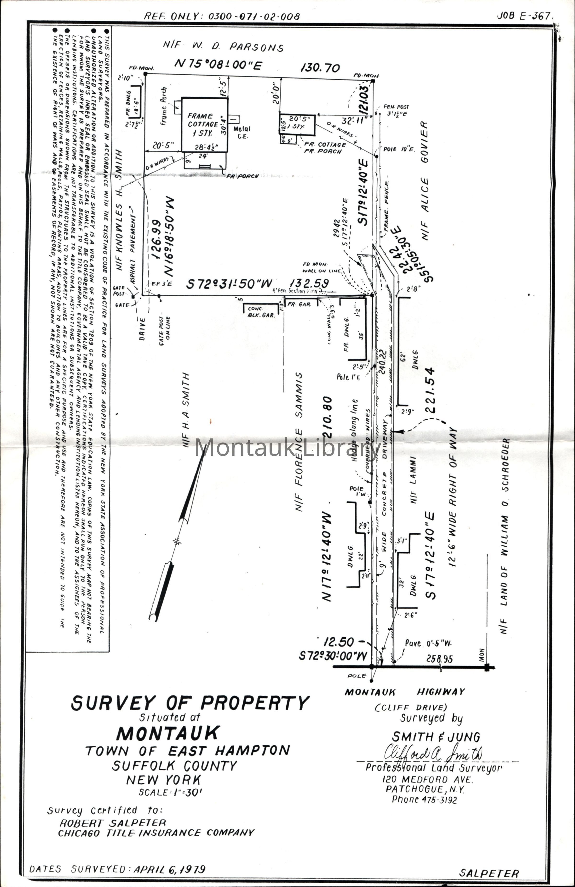 A collection of real estate materials related to properties in Montauk owned by Robert Salpeter and partner Rolf Sauer. The documents include contracts of sales, surveys, certificates of occupancy, and loan statements for properties on Old Montauk Highway, Miller Avenue, Tuthill Road, South Emery Street, and South Euclid Avenue. The papers date from 1979 to 1998.Archive Details