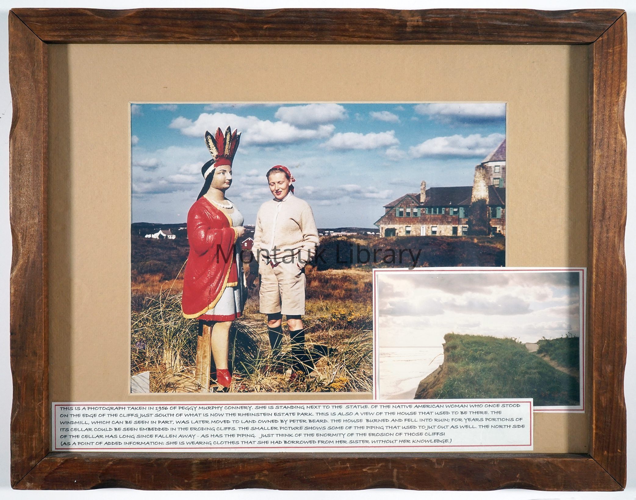 Inscription reads: This is a photograph taken in 1956 of Peggy Murphy Connery. She is standing next to the statue of the Native American woman who once stood on the edge of the cliffs just south of what is now the Rheinstein Estate park. this is also a view of the house that used to be there. The windmill, which can be seen in part, was later moved to land owned by Peter Beard. The house burned and fell into ruin, for years portions of its cellar could be seen embedded in the eroding cliffs. The smaller picture shows some of the piping that used to jut out as well. The north side of the cellar has long since fallen away - as has the piping. Just think of the enormity of the erosion of those cliffs! (As a point of added information, she is wearing clothes that she had borrowed from her sister without her knowledge).