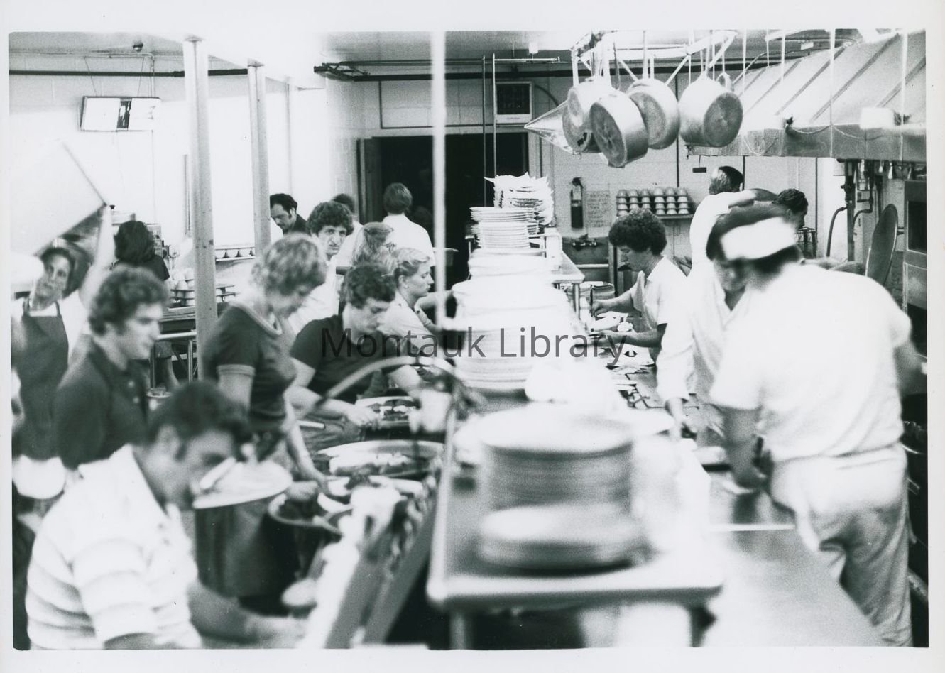 Maria-Louise Sidoroff, Ph.D. (b. 1936), an anthropologist specializing in prehistoric ceramic technology, was working at Gosman’s as a waitress in 1975 and was friends with Gosman family members, in particular Roberta Gosman Donovan, the daughter of Mary and Robert. Inspired by an anthropological angle as well as a photography class she was taking at the School of Visual Arts, Maria-Louise spent dawn to dusk on Labor Day photographing the restaurant’s kitchen and wait staff as they worked diligently behind the scenes. She managed to capture moments of both organized chaos, from lines of cooks to lines of servers loading up trays to deliver to customers and rest when there was some downtime.