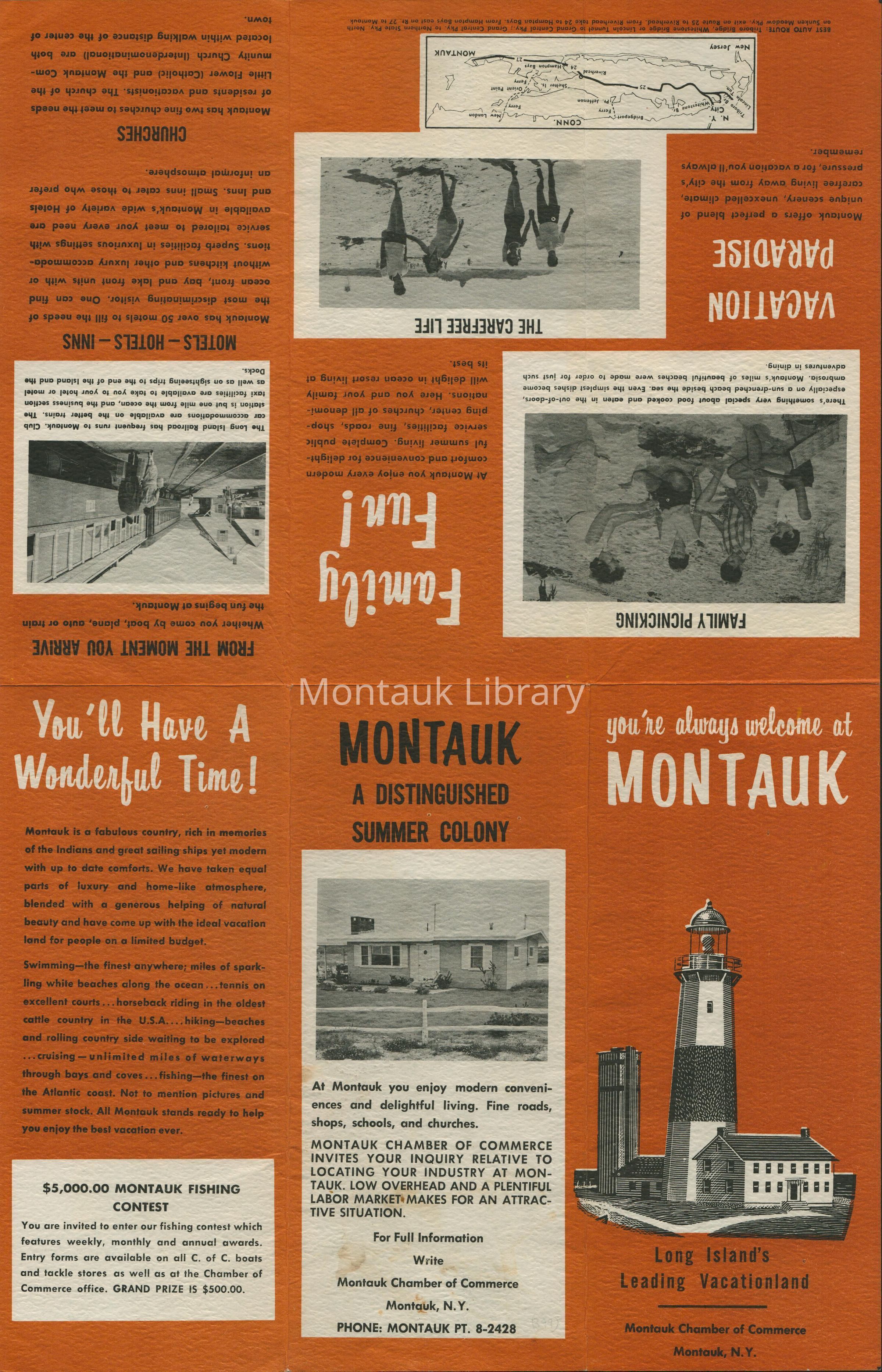 Brochure from the Montauk Chamber of Commerce promoting Montauk's beaches, fishing, riding, motels, churches, and carefree life.Publication Details