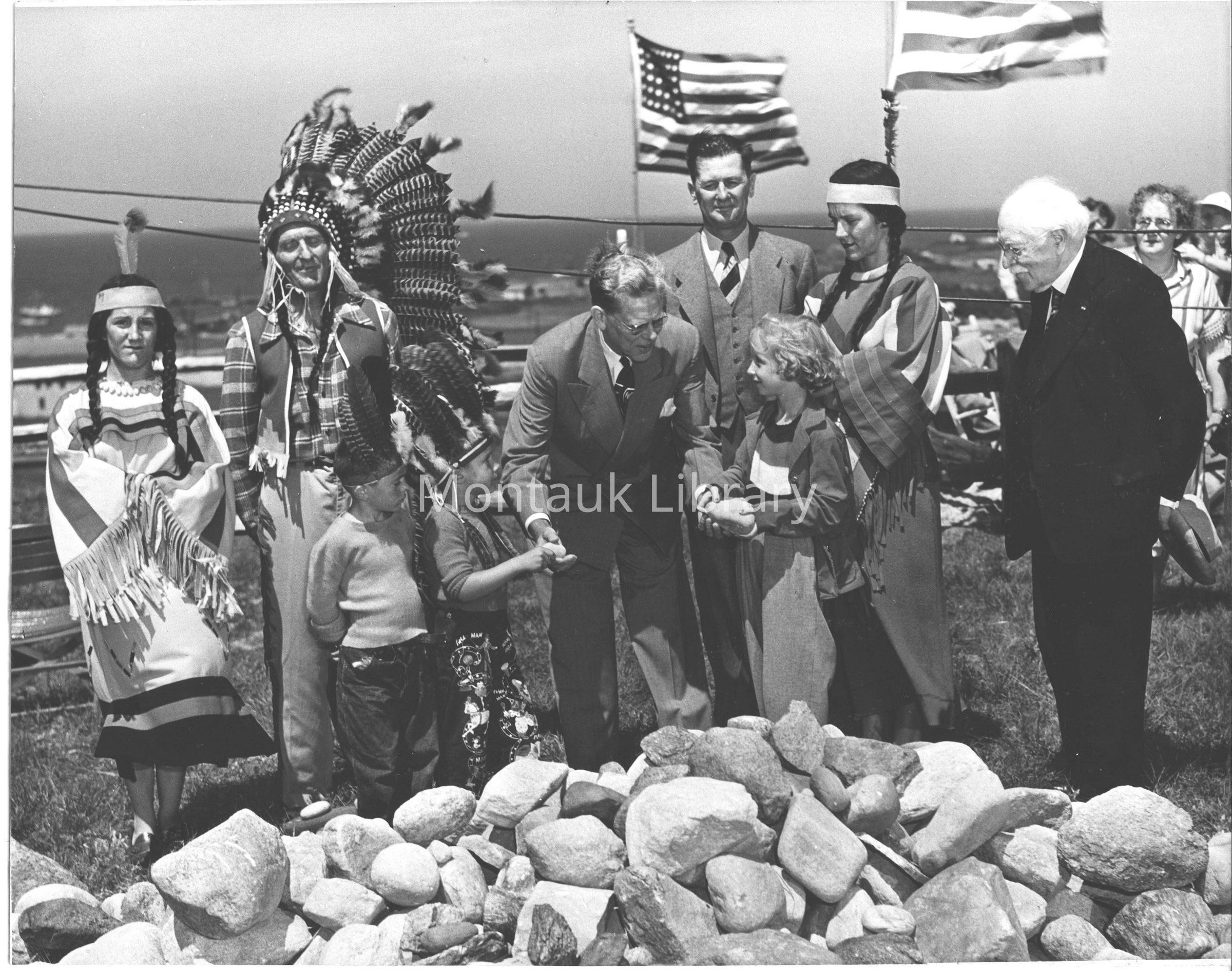 Al and his wife Vera took their family on vacation to Montauk in 1964, ultimately buying a Leisurama home in Culloden Shores. After retiring from Basso Printing at age 65, Holden immersed himself full-time in the Montauk community, championing the virtues of the Village as a member of the Chamber of Commerce. In addition to starting Holden Publications, he became the voice of a popular Montauk radio program on WLNG, interviewing local residents in the belief that his radio shows would bring more tourists to Montauk. (These on-air conversations were later converted into interviews for his Almanacs.) Holden’s enthusiasm for Montauk can be seen in the photo accompanying this entry (Al Holden is the last person on the right).