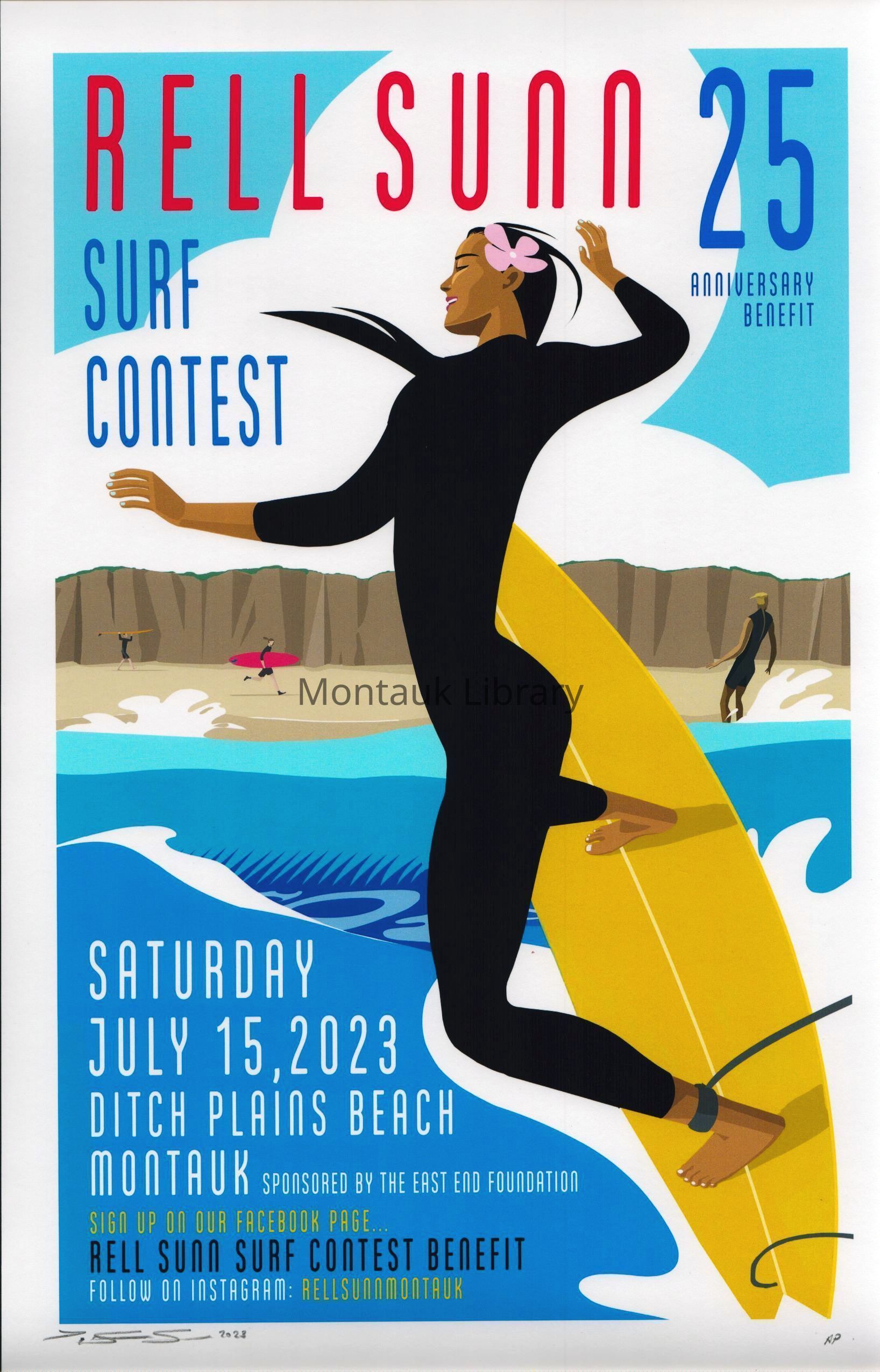 A portfolio of 10 posters promoting the Rell Sunn Surf Contest held annually at Ditch Plains Beach in Montauk, sponsored by the East End Foundation. The posters feature artwork by Alison Seiffer. The artist produced archival giclee printed artist proofs from the original poster designs dating from 2014 to 2023.Type of Print