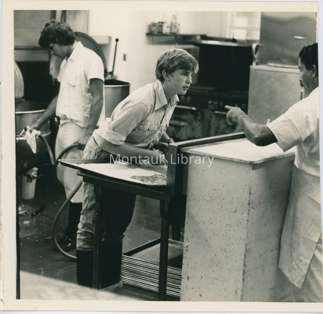 This is a photographic documentary of Labor Day scenes in 1975 at Gosman’s Restaurant in Montauk, N.Y. Mary and Robert Gosman started the waterfront establishment as a small chowder stand in 1943, originally serving fishermen, but by 1975 it had grown into a sprawling, highly popular seafood restaurant serving tourists and employing hundreds of locals and seasonal immigrants. Several generations of the Gosman family worked (and continue to work) beside and directly above hired staff.