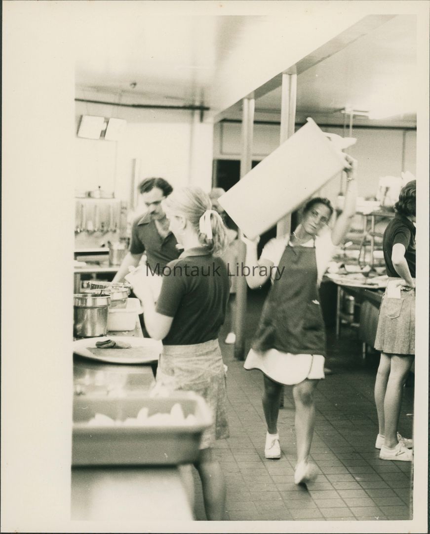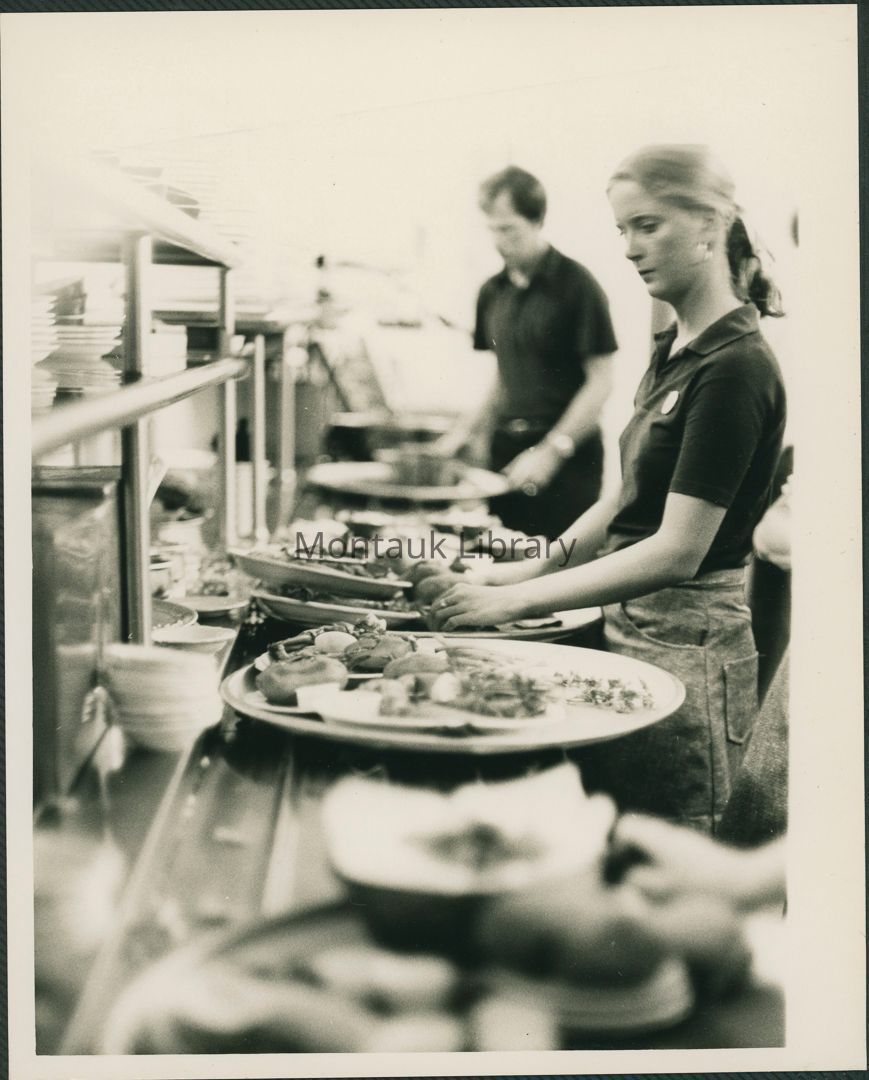Maria-Louise Sidoroff, Ph.D. (b. 1936), an anthropologist specializing in prehistoric ceramic technology, was working at Gosman’s as a waitress in 1975 and was friends with Gosman family members, in particular Roberta Gosman Donovan, the daughter of Mary and Robert. Inspired by an anthropological angle as well as a photography class she was taking at the School of Visual Arts, Maria-Louise spent dawn to dusk on Labor Day photographing the restaurant’s kitchen and wait staff as they worked diligently behind the scenes. She managed to capture moments of both organized chaos, from lines of cooks to lines of servers loading up trays to deliver to customers and rest when there was some downtime.