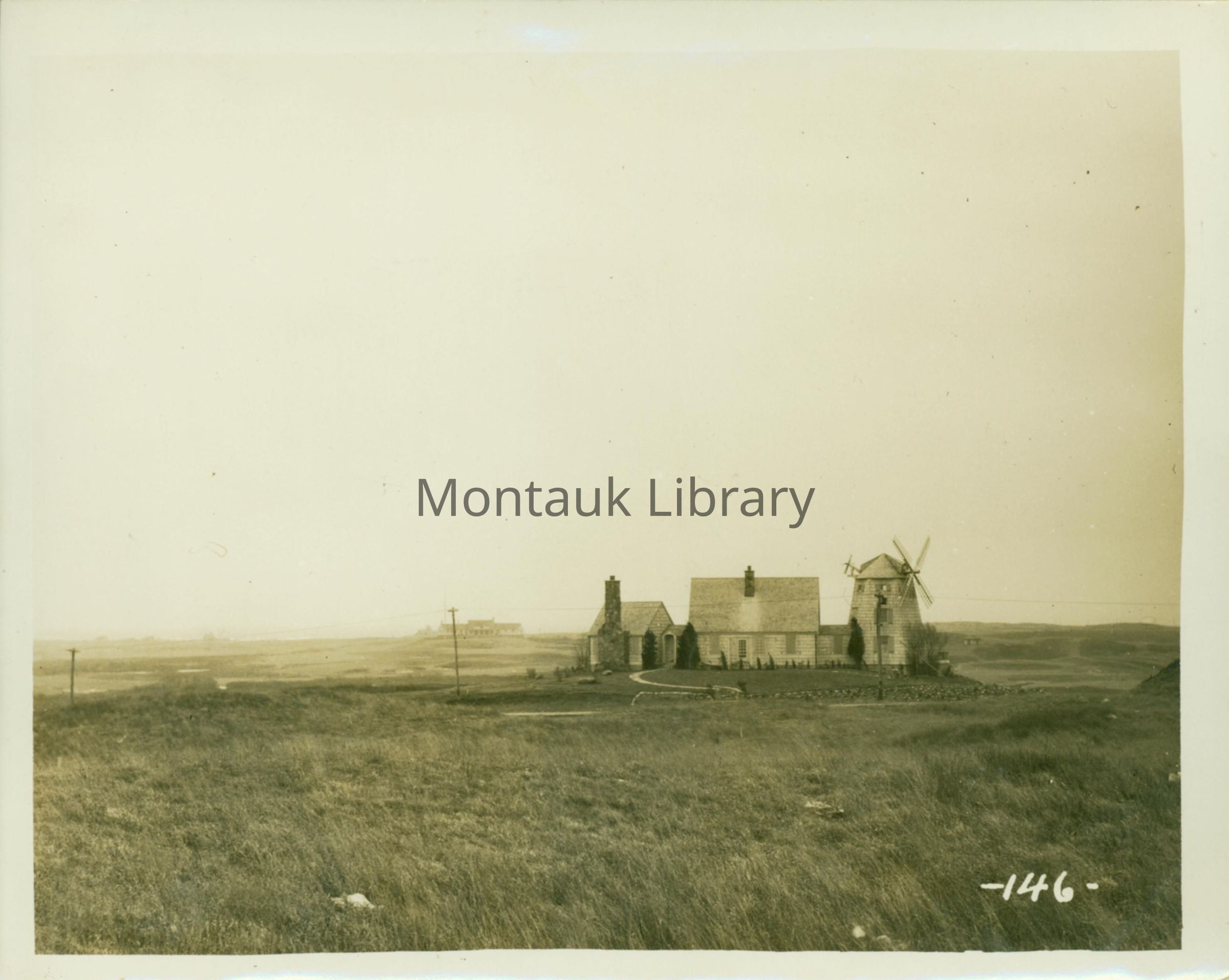 Photograph of the windmill house built by Arthur W. B. Wood in 1928 in Montauk, New York. View looks south toward the golf club and ocean.Copyright